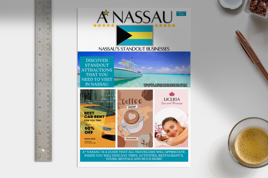 Welcome to A* Nassau. We are a marketing magazine aimed at tourists that can be found in hotels & high end Airbnbs all around the beautiful Nassau.